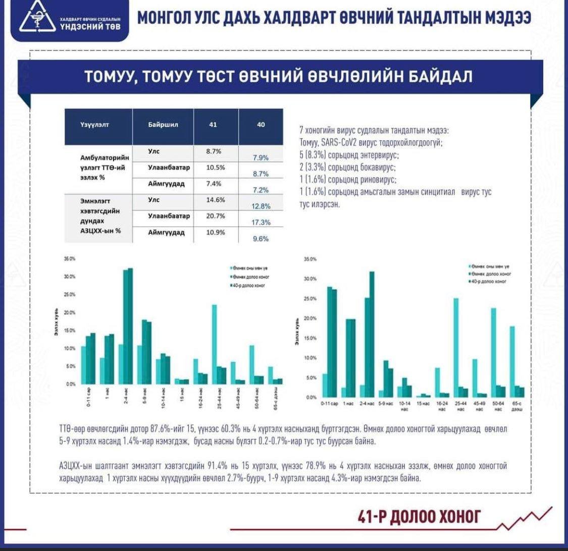 Тэгвэл Монгол Улс дахь томуу, томуу төст өвчний өнгөрсөн долоо хоногийн тоон үзүүлэлтийг харвал тус өвчнөөр өвдсөн иргэдийн 87,6 хувийг 15, үүнээс 60,4 хувийг дөрөв хүртэлх насны насны хүүхэд эзэлж байна. Энэ нь өмнөх долоо хоногтой харьцуулахад өвчлөл 5-9 хүртэлх насныханд 1,4 хувиар нэмэгдэж, бусад насны бүлэгт 0,2-0,7 хувиар тус тус буурсан байна. Эмнэлэгт хэвтэн эмчлүүлэгсдийн 91,4 хувь нь 15 хүртэлх, үүнээс 78,9 хувь нь дөрөв хүртэлх насны хүүхэд байна. ХӨСҮТ тандалытн мэдээнээс харахад хүнд хэлбэрийн өвчлөл үүсгэдэг томуугийн А, В хүрээний вирусын тархалт баг ба харин томуу төст энтеровирус, бока вирус синцитал вирус орчилд байна.