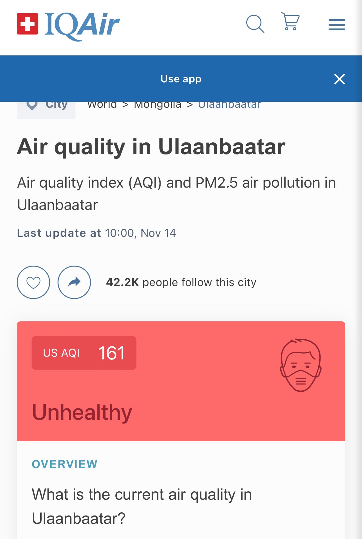 Дэлхийн хотуудын агаарын чанарыг цагийн горимд хэмжиж харуулдаг Швейцарын IQAir-ийн вебсайтад өнөөдрийн байдлаар Монгол улсын нийслэл Улаанбаатар хот хамгийн муу агаартай хотуудын 6-рт жагсаж байна.